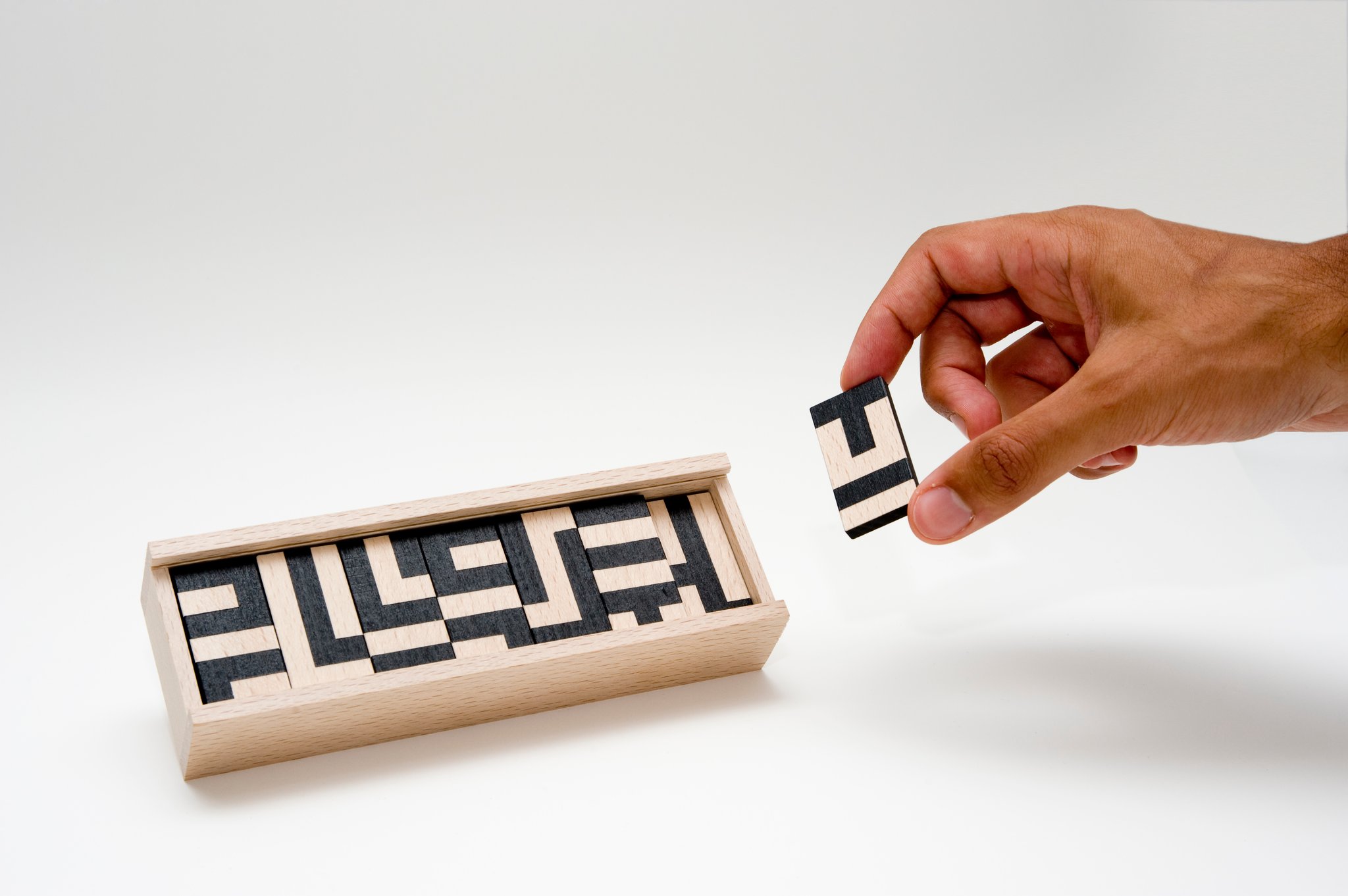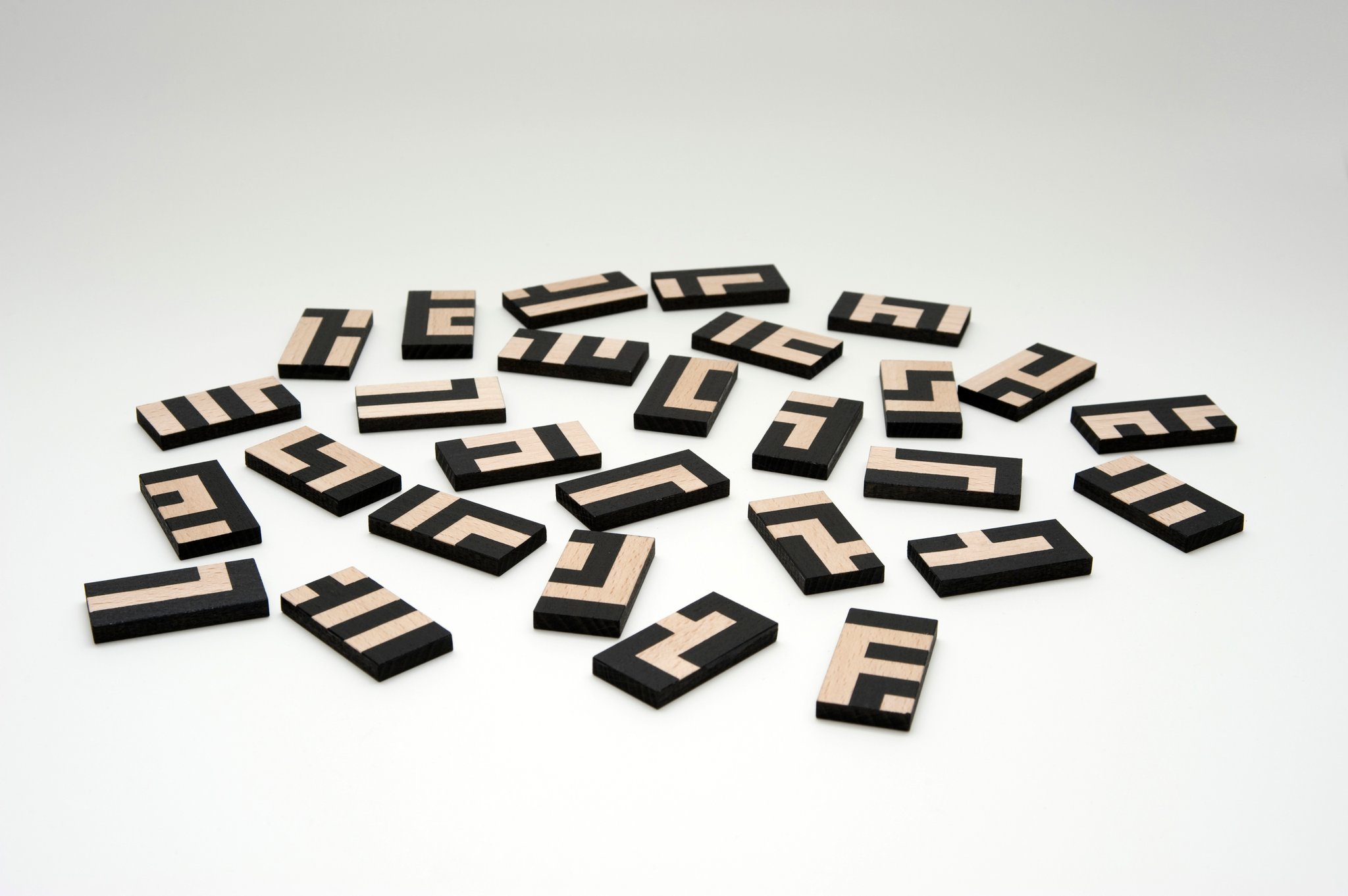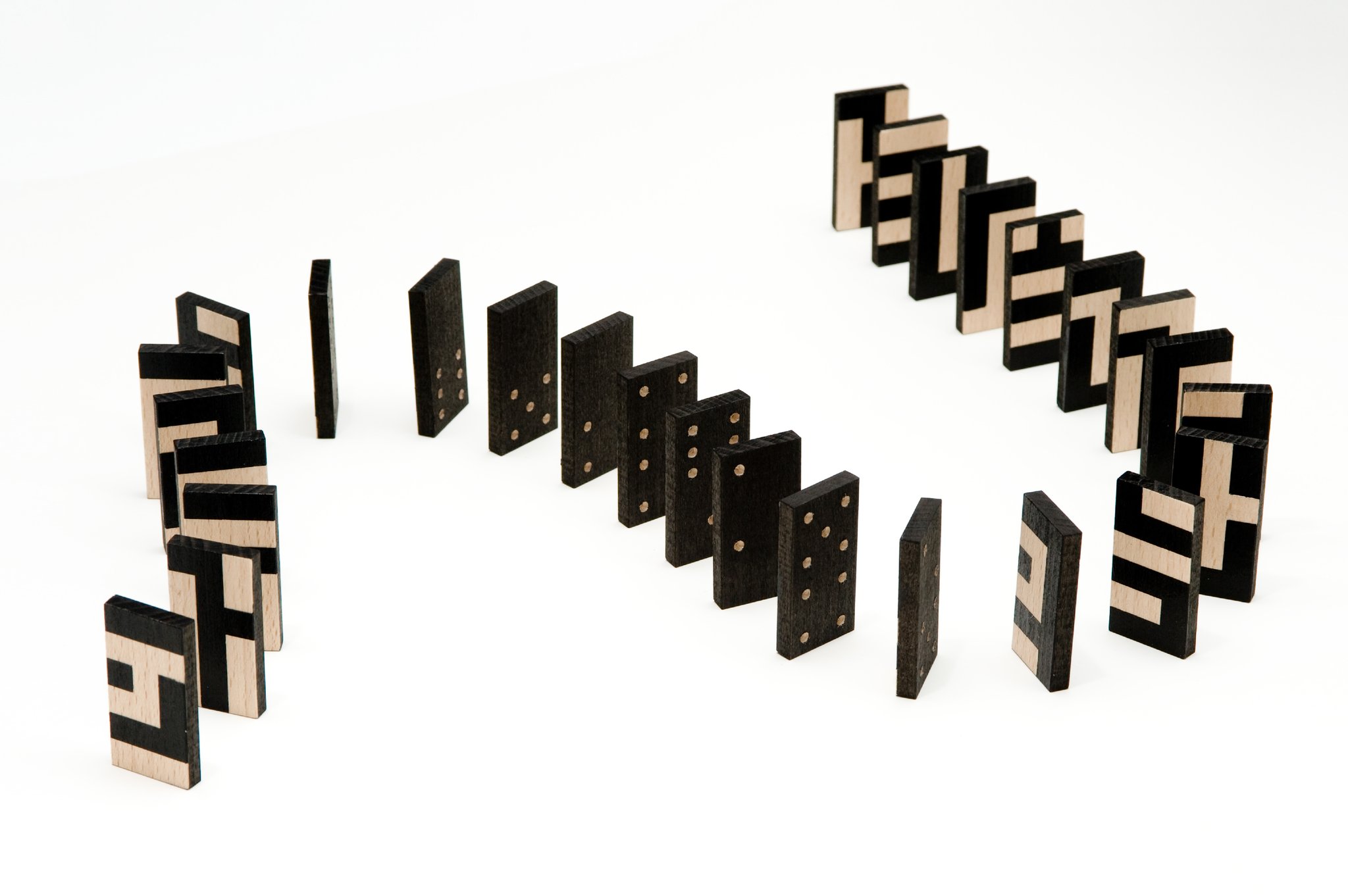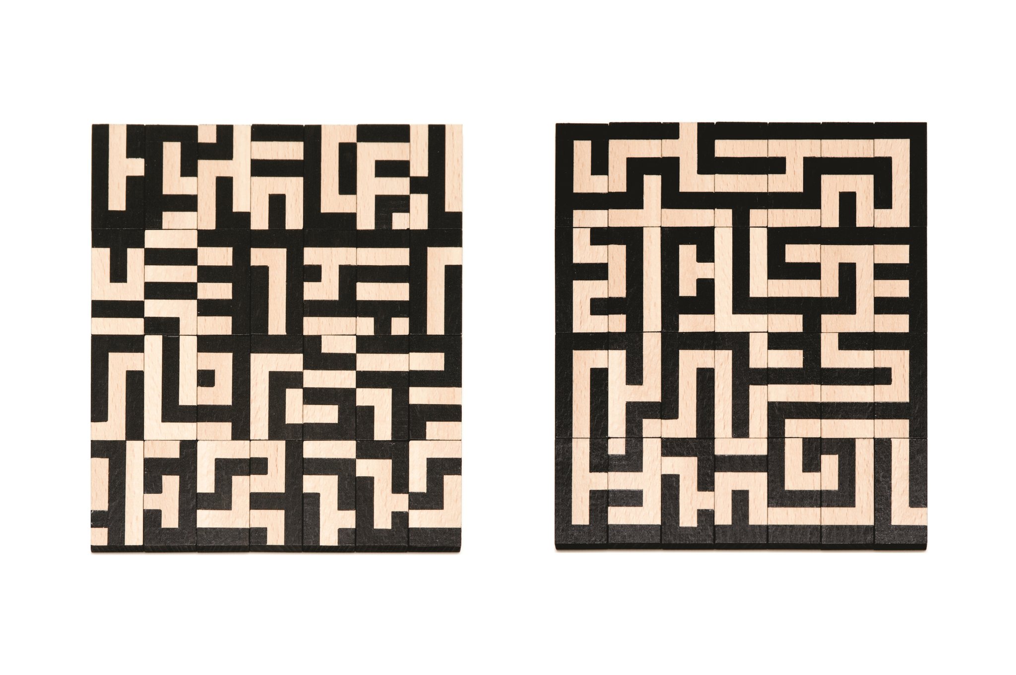 MazePuzzleDomino presents three games in one. One side of its wooden pieces displays a classic domino design, while on the other is a complex puzzle that can form an intriguing maze producing an elegant and minimalist design.